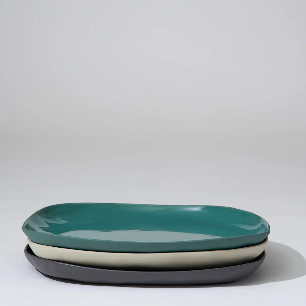 Hand cast ceramic plate with a subtle irregular shape.