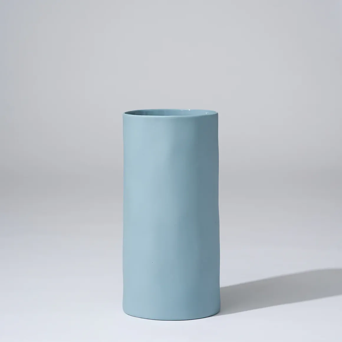 Hand cast cylindrical shaped ceramic vase.